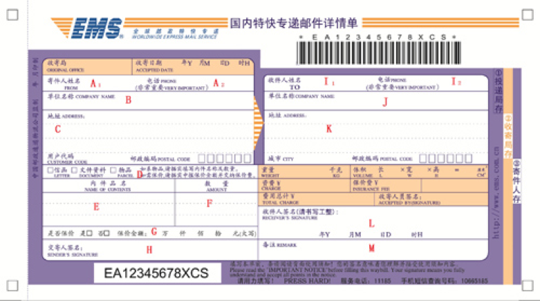 - The customer should write the correct destination zip code in the column of recipient address on the EMS waybill (except shipments to Hong Kong);