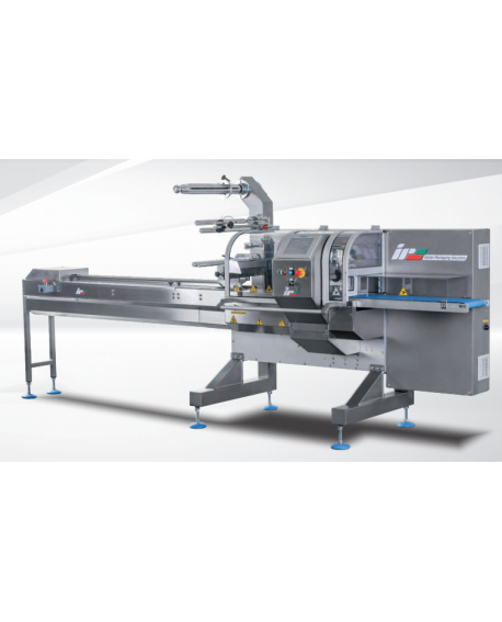 Electronic rotary jaws flow-pack machine with film roll from the top. Its main features are reliability and adaptability, which allow the machine to fulfill both medium and high production requirements. Also available with different automatic feeding systems.