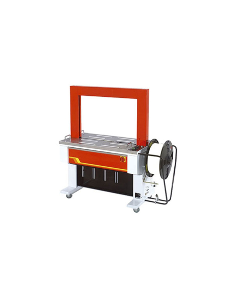 Brugt automatisk omsnøringsmaskine med 850×600 mm bøjle til 12 mm PP-bånd. Fuldserviceret, testet og i god, driftsklar stand, ideel til generel omsnøring af emner op til 100 kg og hastigheder på op til 29 cyklusser pr. minut.