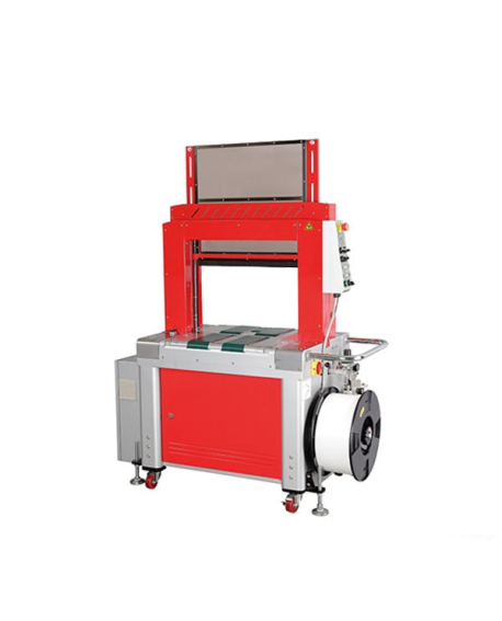 STEP TP-702BP er en fuldautomatisk omsnøringsmaskine med dobbelt pneumatisk tryk, der er ideel til komprimerbart strop, såsom bølgepapir, papirark, plastikplader, poser mv.